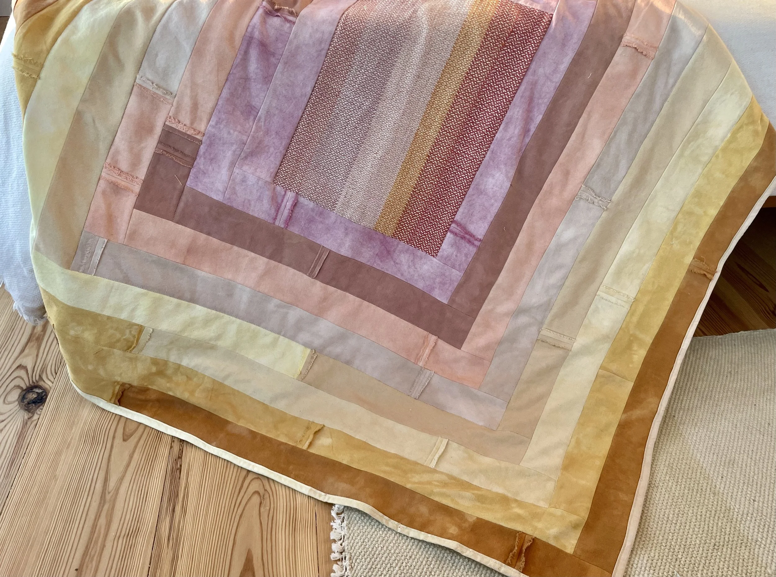Mixed media work with botanically dyed cotton and wool, weaving and quilting.
